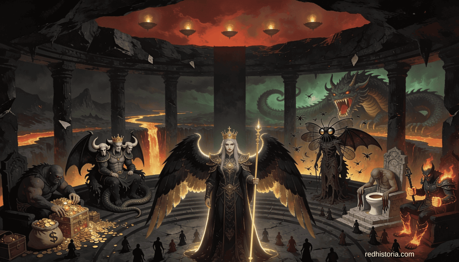 La demonología cristiana medieval concibió el infierno como una corte organizada, con siete príncipes presidiendo cada uno sobre uno de los siete pecados capitales. Esta jerarquía, sistematizada definitivamente por el obispo Peter Binsfeld en 1589, refleja la idea de que el mal tiene estructura, función y cadena de mando. Crédito: Red Historia