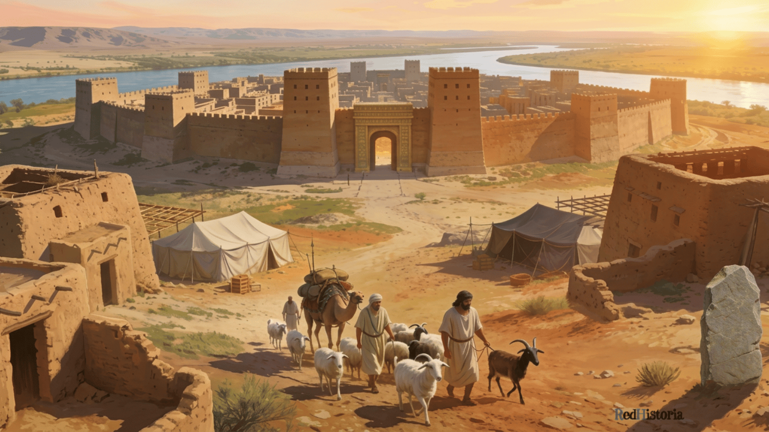 Campamento amorrita en Mesopotamia durante el segundo milenio antes de Cristo. La fortaleza representa la adopción de arquitectura mesopotámica sedentaria, mientras que los rebaños y tiendas muestran la herencia nómada amorrita. Esta síntesis de tradiciones fue fundamental en la transformación de los amorritas de mercenarios externos a gobernantes de Babilonia bajo Hammurabi. Crédito: Red Historia