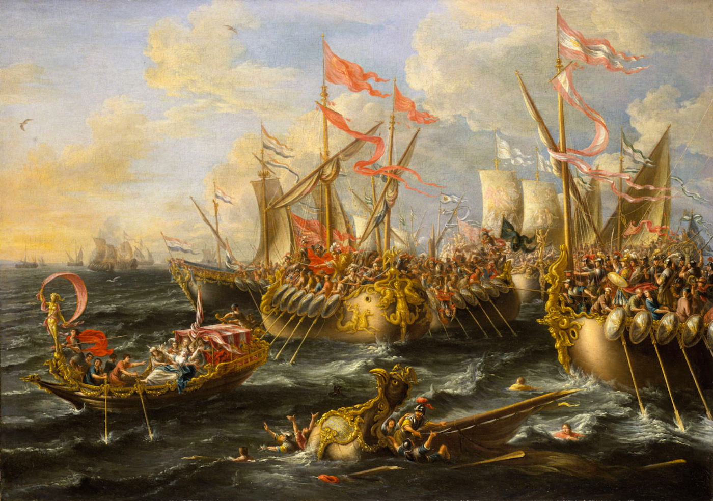 La batalla de Actium (31 a.C.), en la que Octaviano derrotó a Marco Antonio y Cleopatra, poniendo fin a las guerras civiles romanas e iniciando el Imperio. En primer plano, la barca de Cleopatra huyendo del combate. Obra de Laureys a Castro, 1672. National Maritime Museum