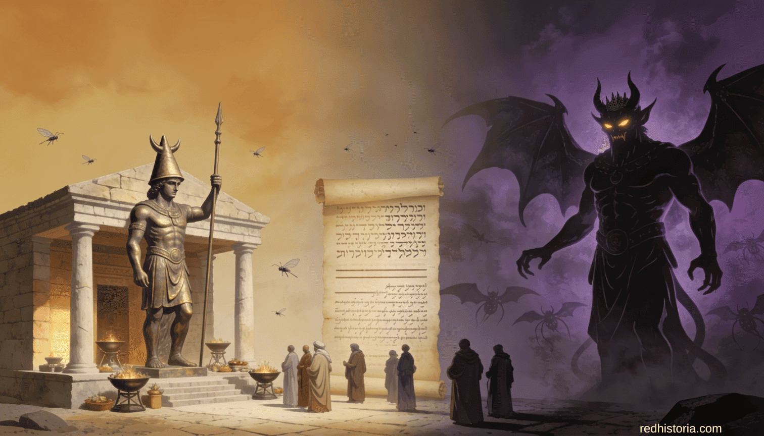 De todos los seres que pueblan la jerarquía demoníaca de la tradición cristiana occidental, pocos tienen una historia de origen tan precisa y tan bien documentada como Belcebú. No es una figura surgida de la imaginación apocalíptica ni una construcción teológica abstracta: es un dios real, venerado en un lugar concreto, con una función específica y una ciudad identificable, que a través de un proceso de demonización de varios siglos acabó convirtiéndose en el segundo en la jerarquía del infierno, el príncipe de los demonios que el Nuevo Testamento contrapone directamente a Jesucristo.