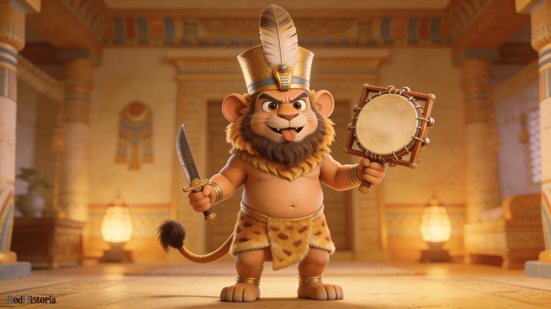Bes, el dios enano protector del hogar, empuña una daga en una mano y un sistro musical en la otra. Su lengua sobresale en expresión feroz y juguetona simultáneamente, simbolizando su rol como guardián del hogar y promotor de la alegría familiar.