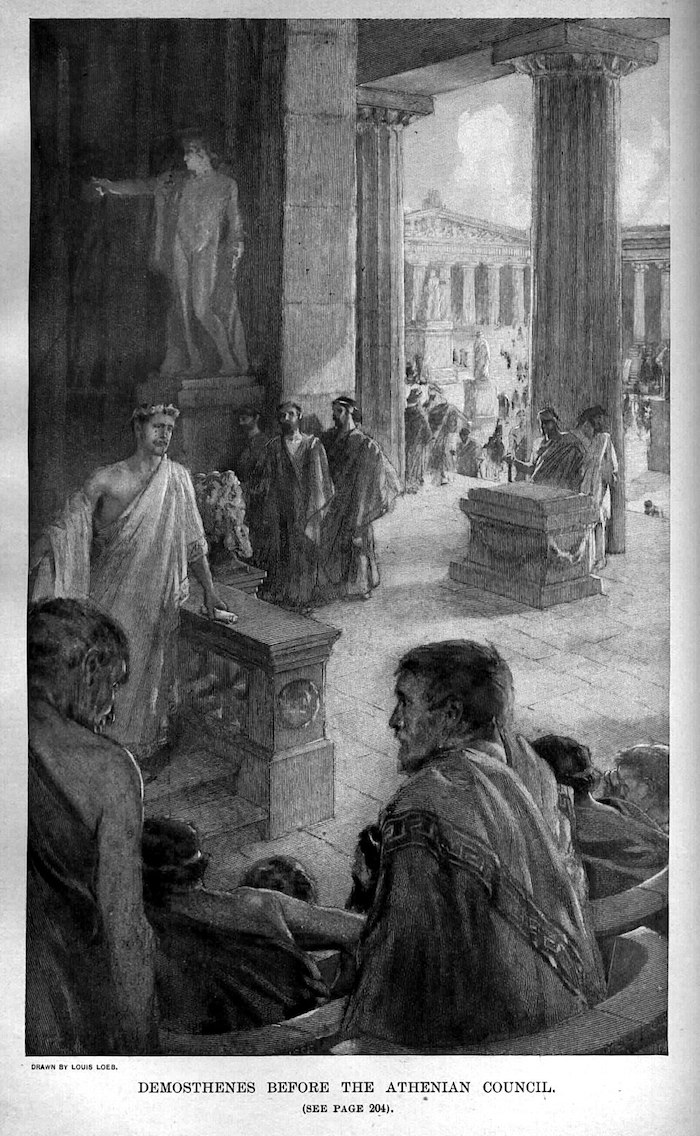Comenzó entonces la campaña de Demóstenes para advertir a Atenas. Alrededor de 351 a.C., pronunció su primer discurso importante sobre Filipo, una de sus Filípicas. Este primer discurso fue diseñado para despertar a Atenas de su sueño político. Demóstenes argumentaba que el tiempo se estaba acabando, que Filipo se estaba volviendo cada vez más poderoso y que Atenas necesitaba tomar medidas militares inmediatas.
