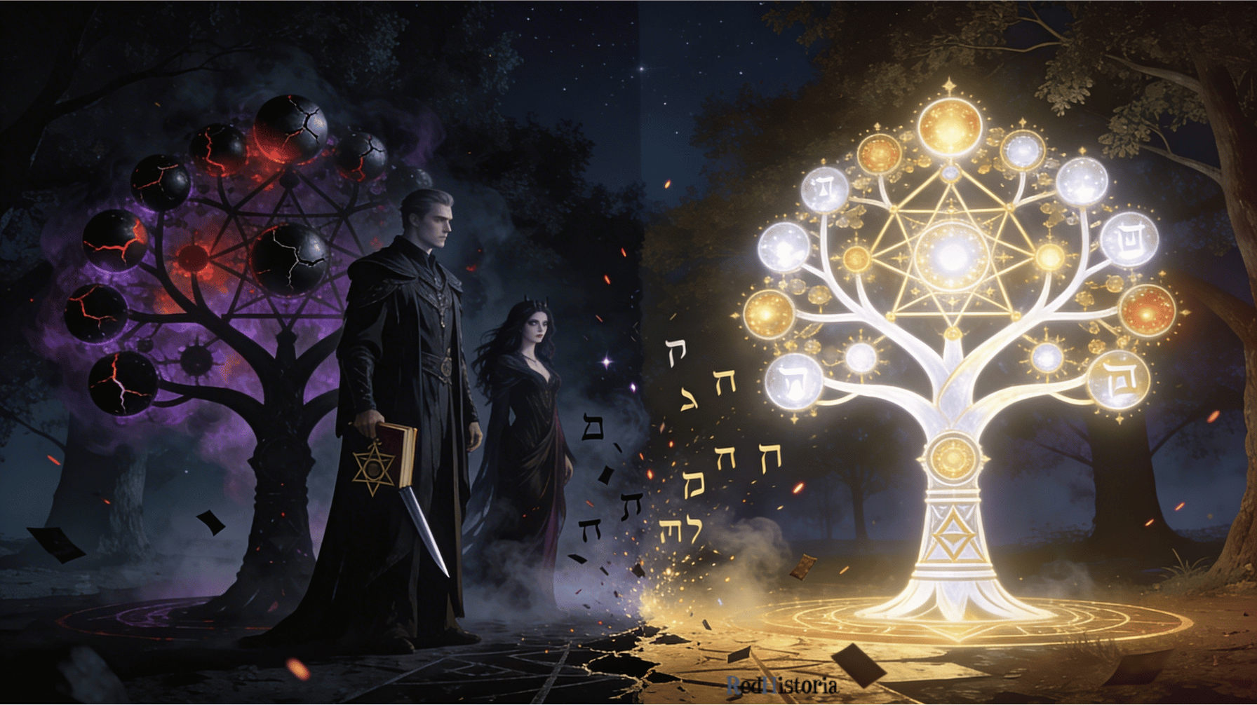 La dualidad cabalística: el Árbol del Mal con sus klipot agrietadas gobernado por Samael y Lilith a la izquierda, frente al Árbol de la Vida luminoso con las diez sefirot a la derecha. Las letras hebreas que flotan entre ambos mundos representan el lenguaje sagrado como territorio en tensión entre lo divino y el Otro Lado. Crédito: Red Historia