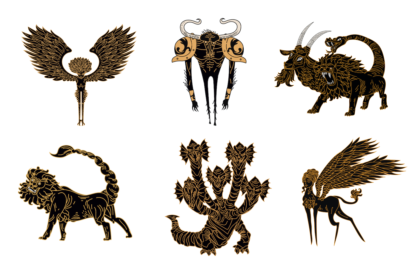Los grifos —cuerpo de león, cabeza y alas de águila— custodiaban oro en las tierras escitas al norte del mundo griego. Heródoto los menciona como criaturas reales que los arimaspos (humanos de un solo ojo) combatían constantemente por el control de yacimientos auríferos. Los grifos representan la fusión del rey de los animales terrestres (león) con el señor de los cielos (águila), creando el guardián supremo de tesoros.