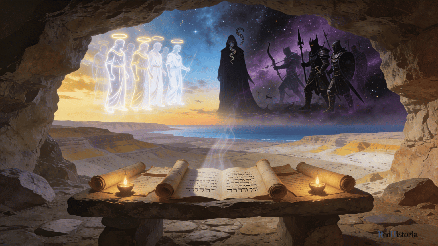 Demonología en los Rollos del Mar Muerto ueva de Qumrán con rollos del Mar Muerto sobre mesa de piedra, y al fondo la guerra cósmica entre los hijos de la luz y el ejército de Belial sobre el paisaje del Mar Muerto