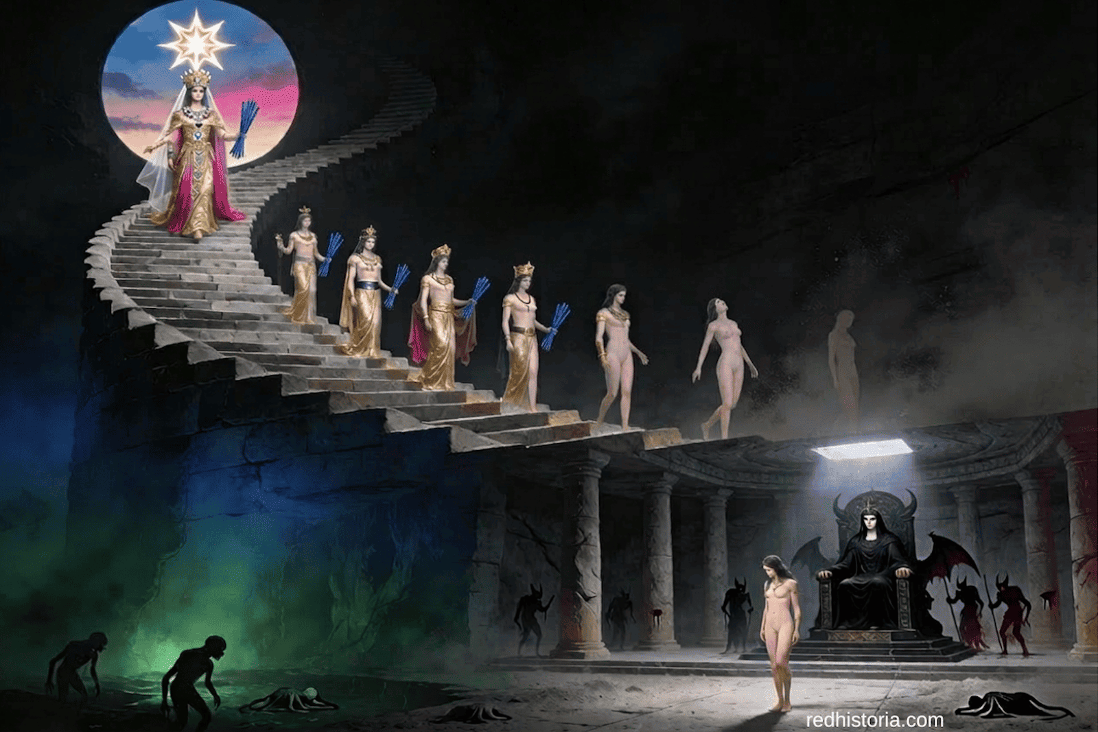 En la religión sumeria, el poema comienza con una de las frases más evocadoras de toda la literatura antigua: «Del Gran Arriba, Inanna puso su oído hacia el Gran Abajo«. Es una frase que en sumerio tiene una resonancia que las traducciones solo pueden aproximar: inanna kur-ra gub-ba-ni, «Inanna se dirigió hacia el kur». La decisión de descender es de Inanna misma, no una imposición externa. Eso es lo primero y lo más desconcertante del mito: la gran diosa elige voluntariamente cruzar la frontera de los muertos.