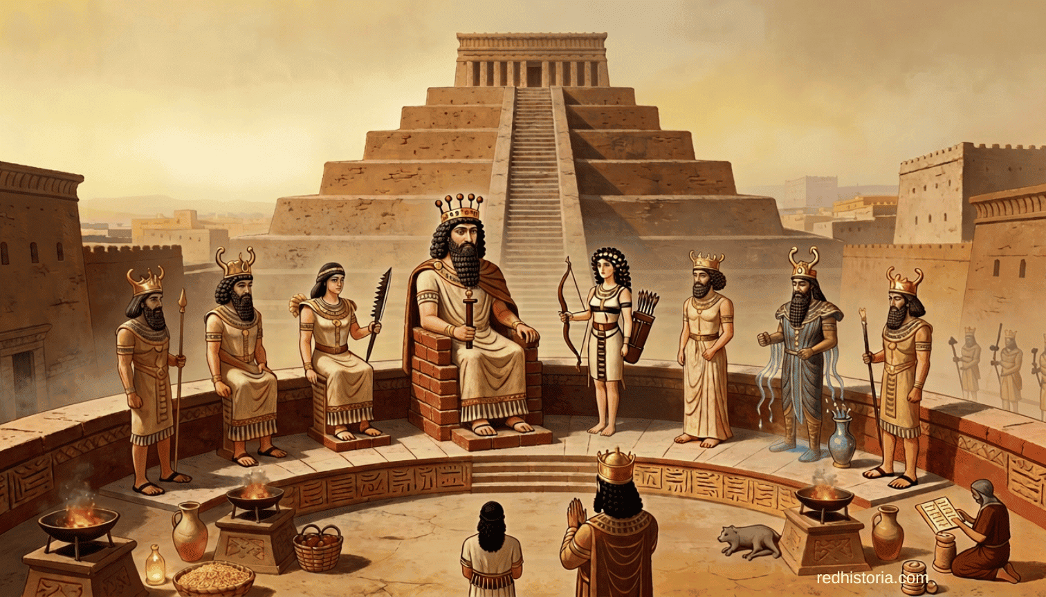 Ceremonia de la religión acadia con rey semidivino ante zigurat, ilustrando la divinización del soberano y el sincretismo religioso del imperio acadio