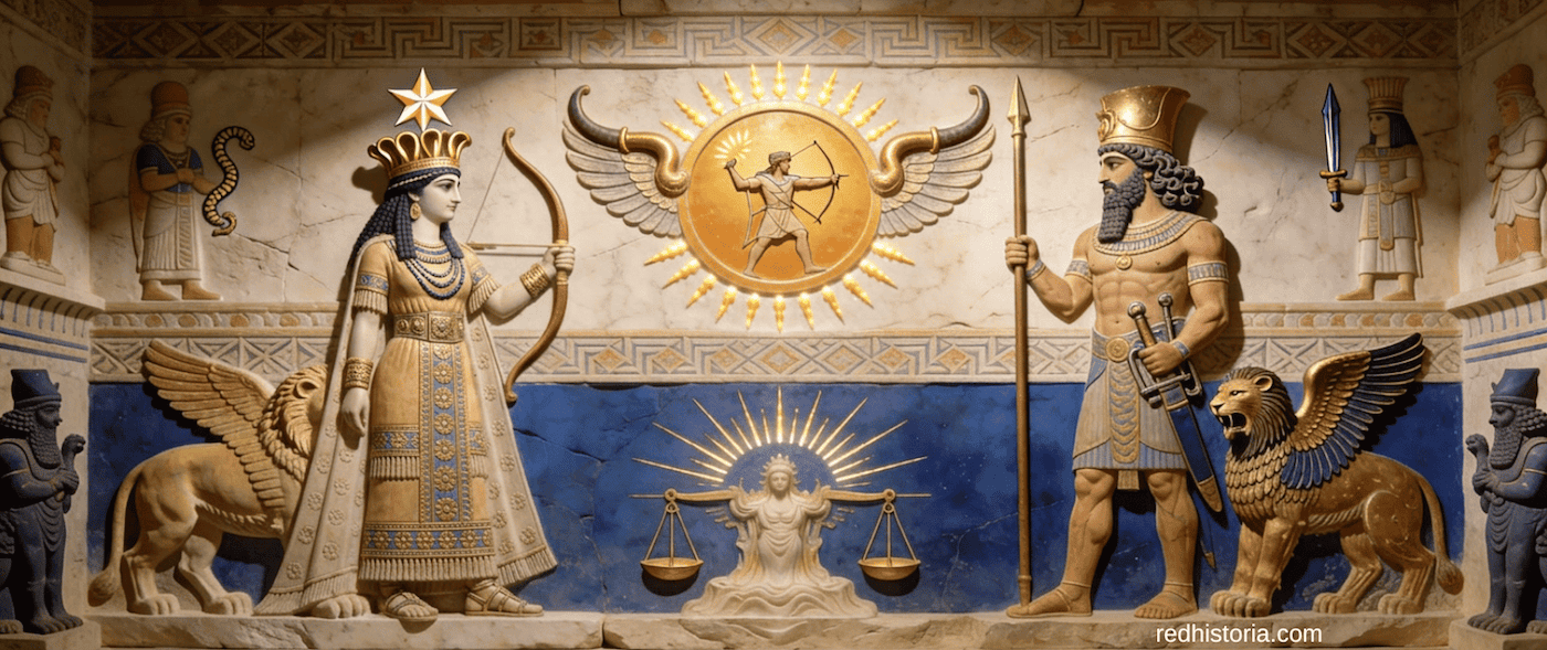 Panteón asirio: El disco alado de Shamash/Assur (centro) flanqueado por Ishtar guerrera (izquierda) y guerrero asirio (derecha). Los Lamassu alados protegen el imperio. La escala de justicia refleja a Shamash legitimando las conquistas imperiales bajo la voluntad divina de Assur. Crédito: Red Historia