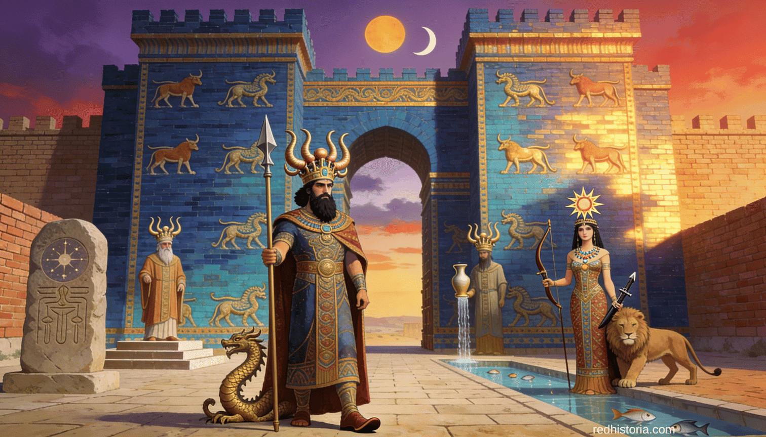 Representación del panteón babilónico completo: Marduk (dios supremo) con su dragón Mushhushshu en el centro, flanqueado por Shamash (dios sol), Ishtar (diosa amor y guerra con león), Sin (dios luna), y otros dioses principales del imperio. Al fondo, la Puerta de Ishtar con sus característicos azulejos azules y dorados, símbolo de la religión oficial babilónica. Crédito: Red Historia