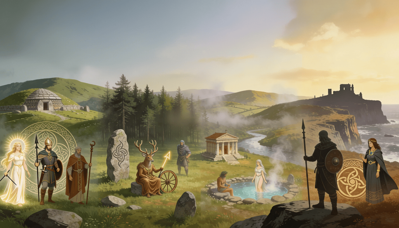 La diversidad del mundo celta se refleja en la fragmentación de sus panteones. Los dioses irlandeses, preservados en una rica tradición literaria medieval, son los mejor conocidos: los Tuatha Dé Danann combatieron en batallas míticas, gobernaron Irlanda durante una edad de oro y finalmente se retiraron bajo tierra a los montículos de las hadas.
