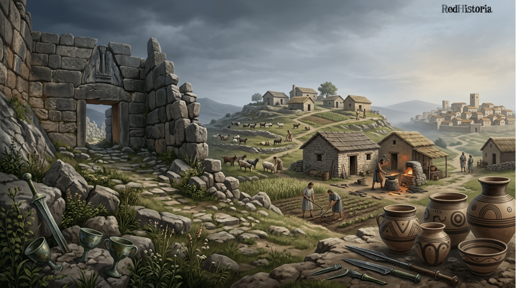 Junto con la escritura se fue también la estructura política centralizada que había caracterizado a los reinos micénicos. Micenas, Pilos, Tirinto y las otras grandes ciudades-fortaleza que habían gobernado amplios territorios mediante complejos sistemas de control político y económico, simplemente dejaron de existir como centros de poder. Los palacios no fueron reconstruidos y las redes administrativas no se recuperaron. Es como si un día desapareciera toda la infraestructura estatal y la gente tuviera que aprender a vivir sin ella.