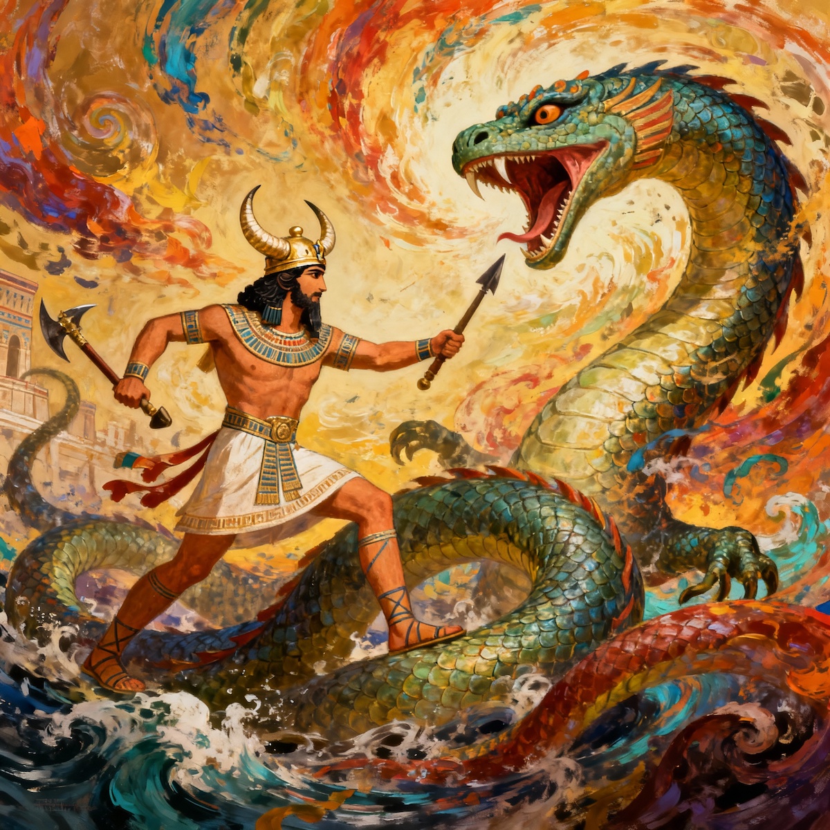 Marduk derrota a Tiamat mediante una combinación de estrategia y poder: la atrae para que abra su boca, dispara vientos hacia su interior inflándola, y luego la mata con una flecha. Del cuerpo muerto de Tiamat, Marduk crea el universo ordenado. Finalmente, crea a la humanidad para servir a los dioses. El Enuma Elish es fundamentalmente la justificación religiosa de la supremacía de Marduk/Babilonia, recitada en festivales religiosos para reafirmar el orden cósmico.
