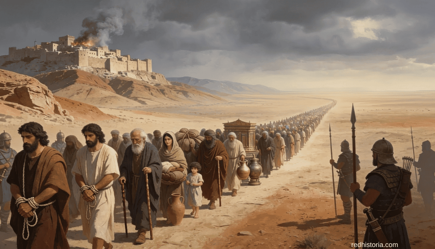 Reconstrucción de la deportación judía a Babilonia en 586 a.C. tras la conquista de Jerusalén por Nabucodonosor II. La imagen muestra la élite judía —familia real, sacerdotes, escribas y artesanos— siendo transportada bajo custodia babilónica hacia Mesopotamia. Al fondo, la ciudad en llamas ilustra la destrucción del Templo. Este viaje marcó el inicio del exilio que transformaría la religión y cultura judía. Crédito: Red Historia