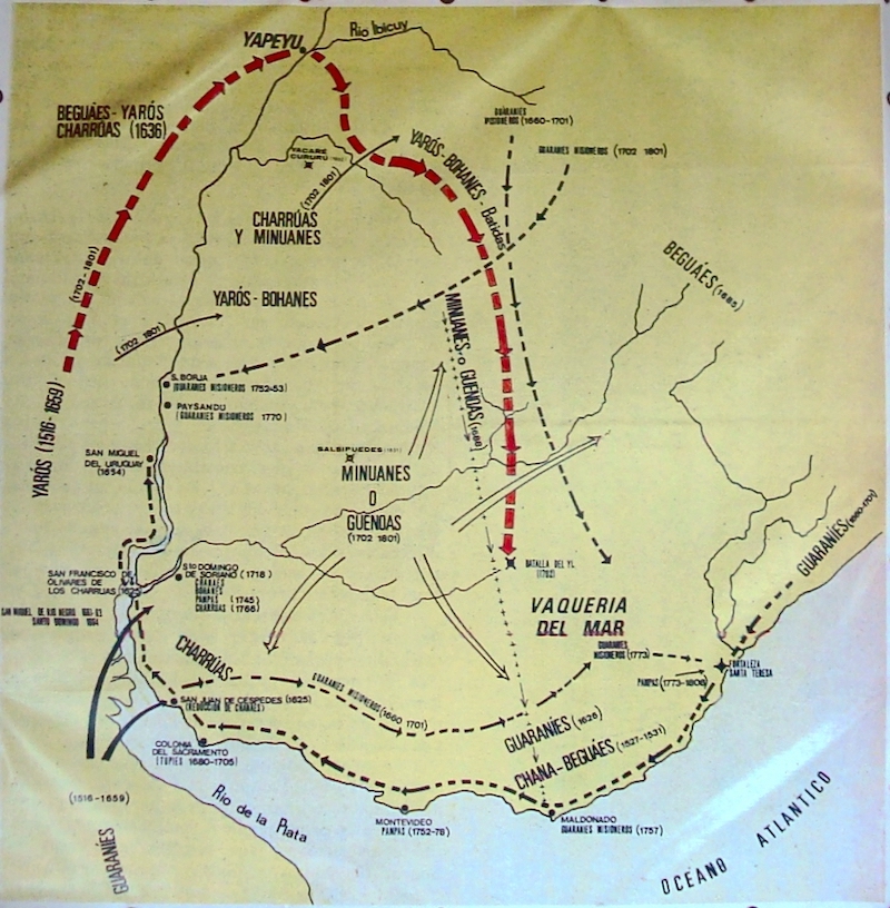 El destino de los pueblos originarios uruguayos fue trágico. Mientras minuanes, bohanes y yaros desaparecieron gradualmente durante el siglo XVIII por enfermedades europeas, guerras y mestizaje, los charrúas sobrevivieron hasta la independencia. Entonces el Estado uruguayo decidió resolver el «problema indígena» mediante exterminio sistemático. La masacre de Salsipuedes (1831) fue el acto más brutal: el presidente Fructuoso Rivera convocó a los principales caciques charrúas a una reunión supuestamente pacífica y ordenó atacarlos por sorpresa, matando a la mayoría. Durante meses posteriores, el ejército persiguió y eliminó sobrevivientes. La historiografía actual caracteriza este proceso como genocidio planificado del Estado para apropiarse definitivamente de territorios indígenas.