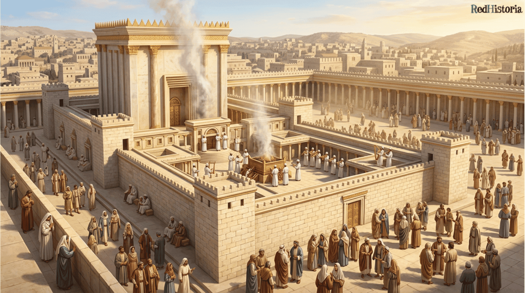 El Templo de Herodes en Jerusalén durante el Segundo Templo (siglo I a.C.). Herodes el Grande reconstruyó completamente el Templo con una plataforma expandida, pórticos columnados grecoromanos y un santuario central dorado, creando la estructura más espléndida jamás construida por judíos en la antigüedad. El Templo era el centro de la vida religiosa judía, donde se realizaban los sacrificios diarios, donde Fariseos y Saduceos competían por autoridad religiosa, y donde Jesús predicó según los Evangelios. La destrucción de este Templo por Tito en 70 d.C. marcó un punto de quiebre: sin Templo, sin sacrificios, la religión judía se reinventó a través de la sinagoga, la oración y el estudio de la Ley, transformaciones que permitieron su supervivencia durante 2.000 años hasta hoy. Crédito: Red Historia