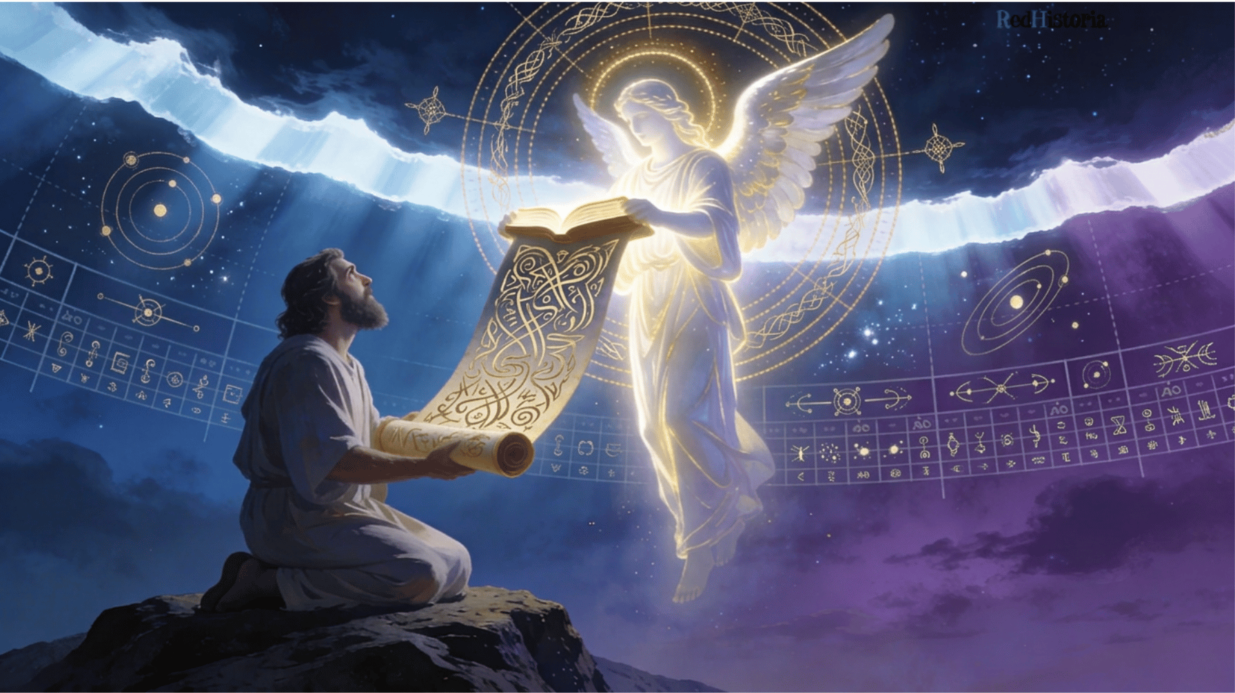 El Ángel de la Presencia dicta el Libro de los Jubileos a Moisés durante los cuarenta días en el Sinaí. Las tablas calendáricas al fondo reflejan la obsesión central del texto: el calendario solar de 364 días que la comunidad autora consideraba la única forma legítima de organizar el tiempo sagrado. Crédito: Red Historia