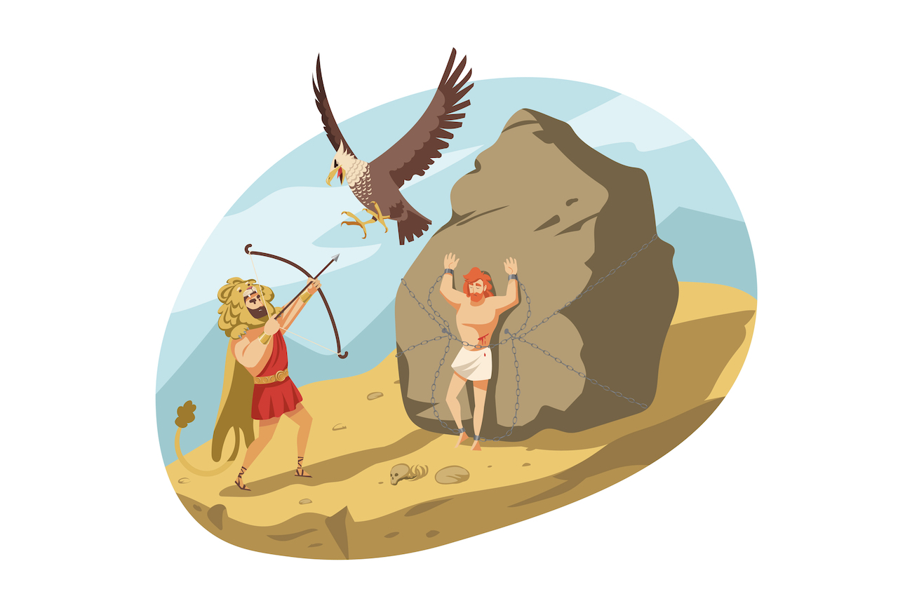 Prometeo fue encadenado en las montañas del Cáucaso con cadenas de adamantina, un metal más fuerte que cualquier otro. Cada día, un águila gigantesca descendía y le devoraba el hígado. Dado que Prometeo era inmortal, el hígado se regeneraba cada noche, perpetuando el ciclo de tortura indefinidamente. Este castigo duró varios milenios hasta que Hércules lo liberó.