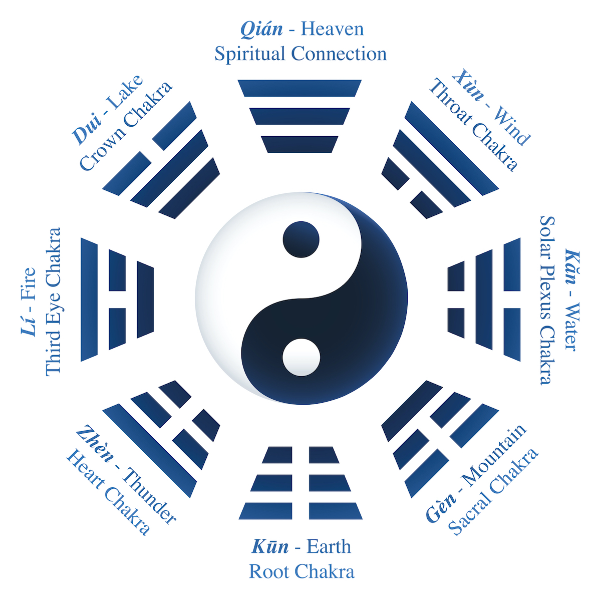 Yin (oscuridad, frío, pasividad, feminidad, tierra, luna) y yang (luz, calor, actividad, masculinidad, cielo, sol) no son opuestos en conflicto sino aspectos complementarios de totalidad. Cada uno contiene semilla del otro; yin extremo genera yang; yang máximo revierte a yin. Este dinamismo perpetuo genera cambio, estaciones, vida, muerte, renacimiento.