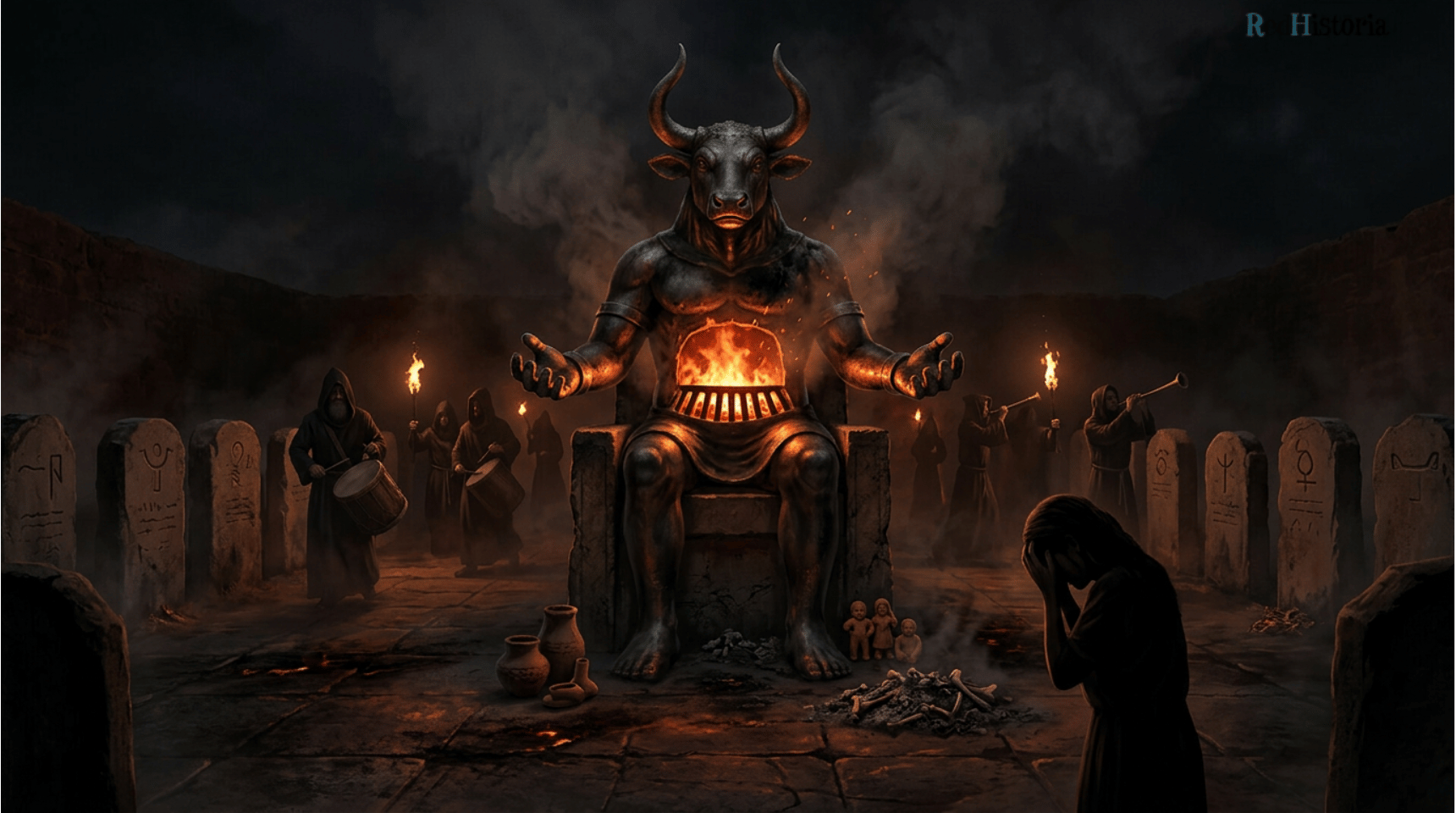 Moloch: el dios del fuego y el sacrificio. Representado con cabeza de toro y cuerpo hueco ardiendo, Moloch es la encarnación del dios-demonio que consume lo más precioso de sus adoradores. Las estelas funerarias circundantes evocan el tophet cartaginés, donde se realizaban sacrificios votivos. Las figuras diminutas de adoradores y sacerdotes subrayan el desequilibrio de poder: un dios insaciable exigiendo ofrendas que nunca sacian su apetito de fuego. Crédito: Red Historia