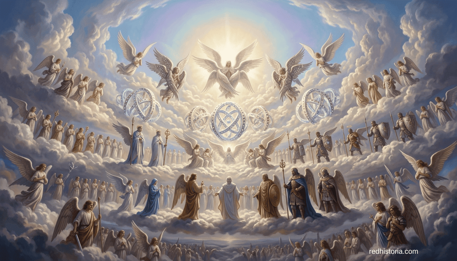 Los nueve coros de ángeles organizados en tres tríadas: serafines de seis alas en lo alto, dominaciones con cetro y arcángeles guerreros en el nivel intermedio, y ángeles mensajeros en el inferior