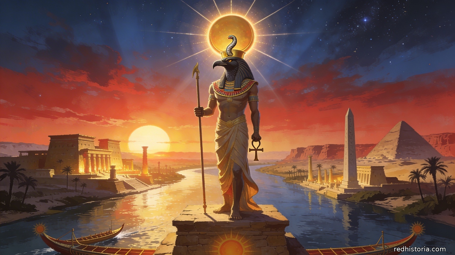 Ra (también Re) era el dios sol del antiguo Egipto, la deidad más importante de la religión egipcia durante gran parte de su historia milenaria. Como disco solar que atravesaba el cielo cada día y descendía al inframundo cada noche, Ra encarnaba el ciclo eterno de vida, muerte y renacimiento que los egipcios consideraban fundamental para el orden cósmico. No era simplemente el sol físico sino el sol divino, fuente de toda vida, calor, luz y tiempo. Los faraones se proclamaban «hijos de Ra», legitimando su poder mediante descendencia divina del dios sol.