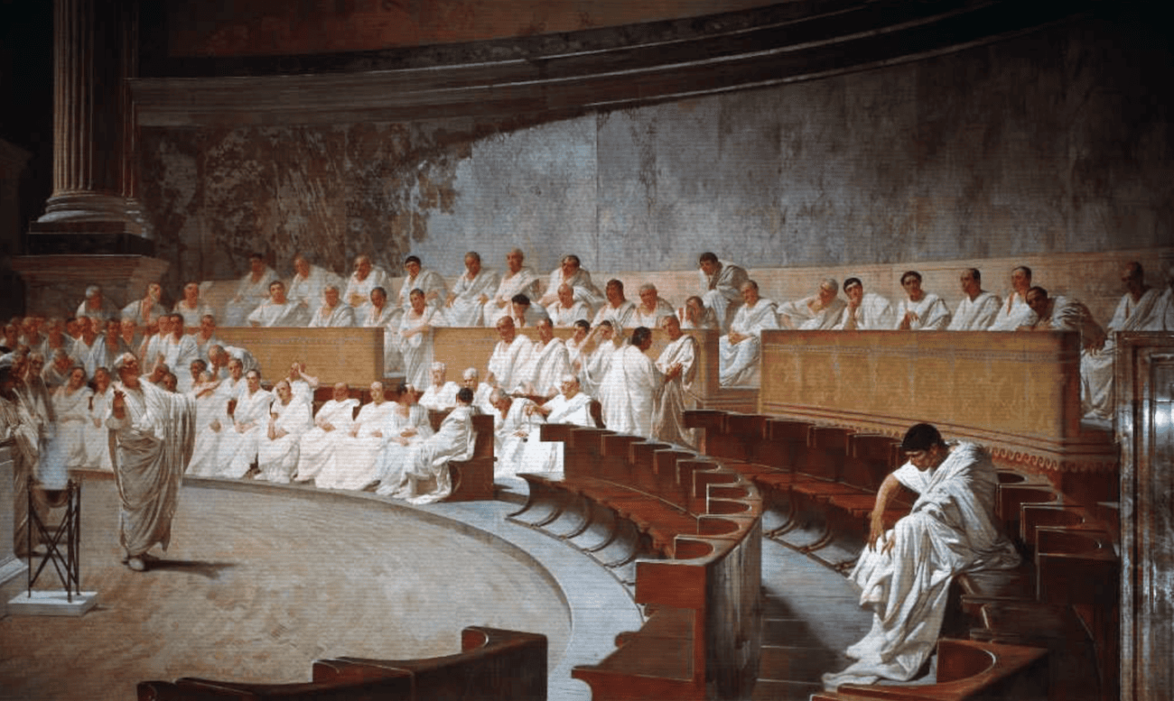 Los senadores, vistiendo sus togas blancas características con franja de púrpura, se reúnen en la Curia Iulia para debatir asuntos de política, guerra y administración imperial. Esta imagen ilustra la disposición física de la asamblea, con senadores sentados en gradas y un orador de pie en el centro, representando el debate formalizado que caracterizaba las sesiones senatoria. Obra: Cicerón denuncia a Catilino, de Cesare Maccari, 1889. Palazzo Madama, dominio público.
