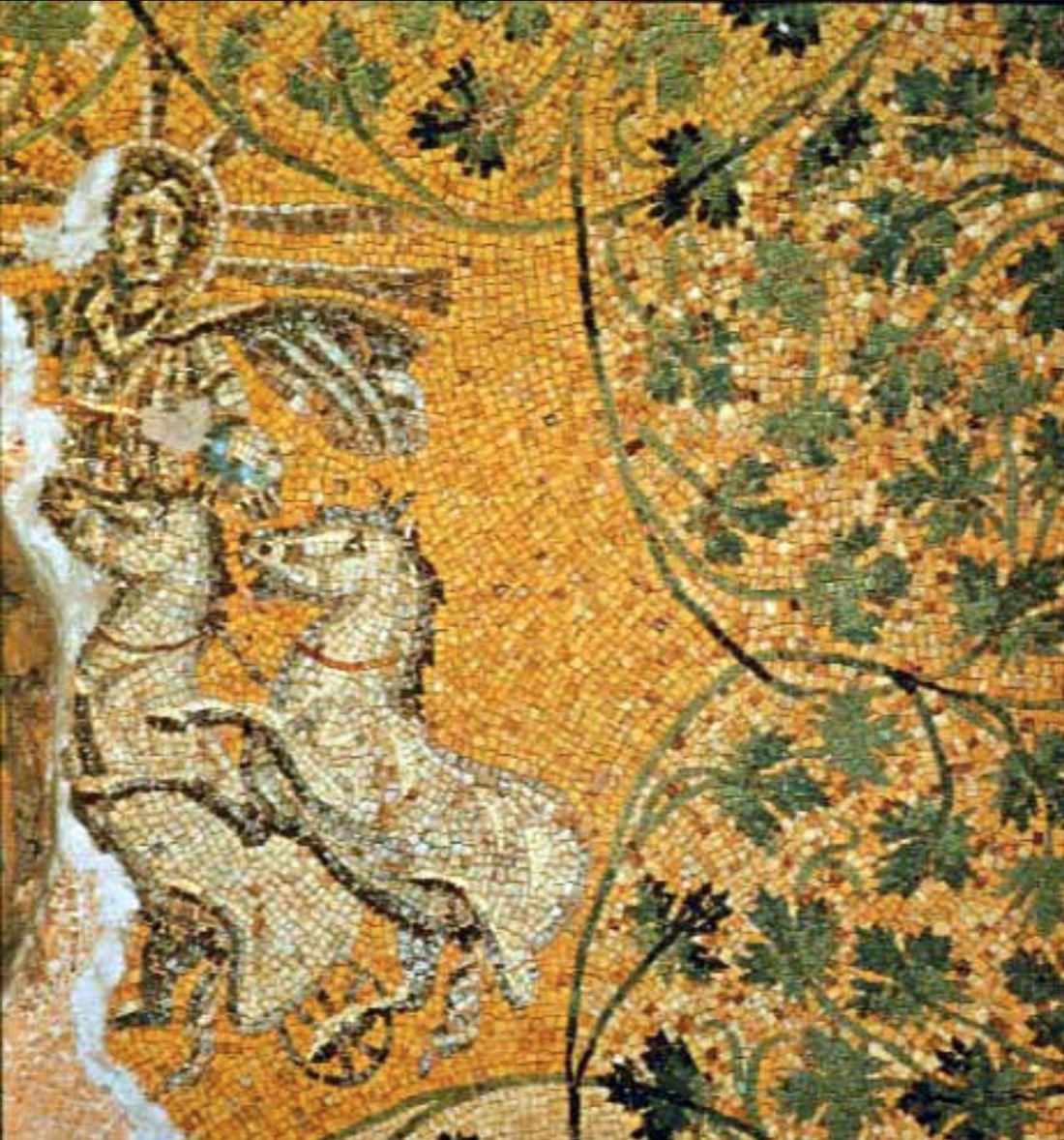 Esta teología solar se manifestaba visiblemente en el arte cristiano primitivo. Mosaicos de los siglos III y IV, encontrados en mausoleos cristianos de Roma, representaban frecuentemente a Cristo con claros atributos solares: una aureola radiante rodeando su cabeza (similar a las representaciones de Helio, el dios griego del sol), ocasionalmente conduciendo un carro a través del cielo, o rodeado de rayos solares mientras cumple funciones de pastor. El mosaico más famoso está en la cripta de San Pedro en el Vaticano, donde Cristo aparece como Christus-Helios, una fusión explícita de la iconografía solar pagana con la identidad cristiana.