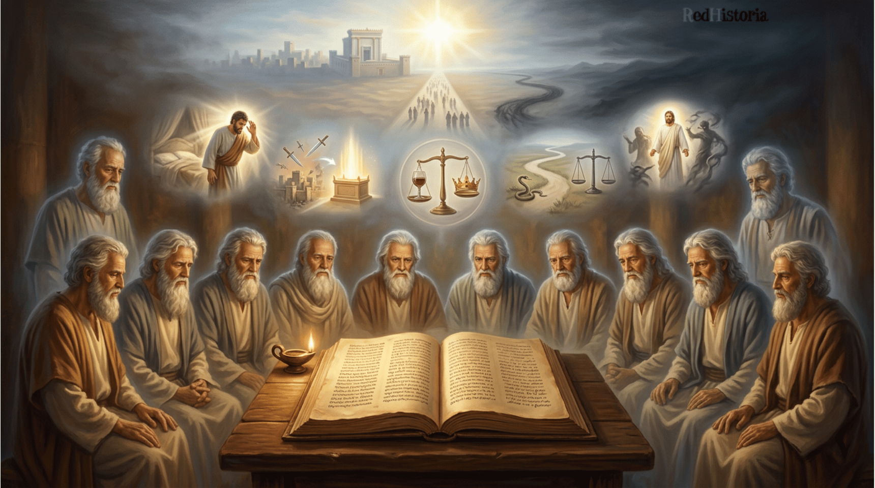 Los Testamentos de los Doce Patriarcas: los doce hijos de Jacob en su vejez reunidos alrededor del texto que contiene sus discursos finales. Los símbolos flotantes —la balanza del juicio, la copa de la tentación, la serpiente de Dan, los caminos que se bifurcan entre Dios y Beliar, condensan los temas éticos y apocalípticos de los doce testamentos. Al fondo, el Templo iluminado de la esperanza mesiánica y la figura de luz combatiendo a la oscuridad. Crédito: Red Historia