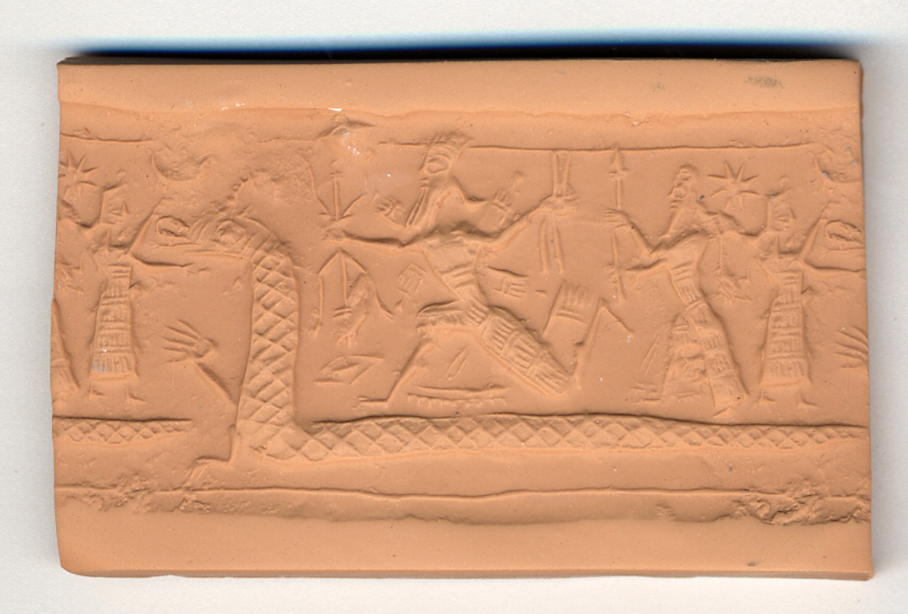 En sellos cilíndricos babilonios (que son nuestras principales fuentes de iconografía visual de este período), Tiamat aparece frecuentemente como un dragón serpiente. Estos sellos, grabados en piedra caliza o roca dura, muestran una criatura elongada, sinuosa, con características de reptil exageradas. A menudo, Tiamat en estos sellos está representada enfrentándose a un dios guerrero (identificado como Marduk) armado con armas de rayo o espada.
