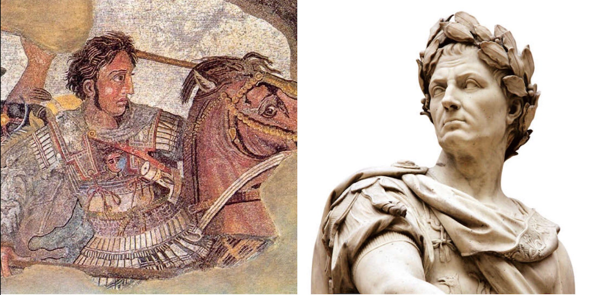 Quizás el par más famoso de las Vidas Paralelas es Alejandro Magno y Julio César. Ambos fueron conquistadores militares extraordinarios que rápidamente crearon imperios vastos. Sin embargo, Plutarco nota diferencias importantes. Alejandro conquistó el mundo oriental a través de una campaña de 13 años de conquista militar continua. Julio César conquistó la Galia (Francia moderna) en 8 años de kampañas militares, luego ganó una guerra civil romana para consolidar su poder.